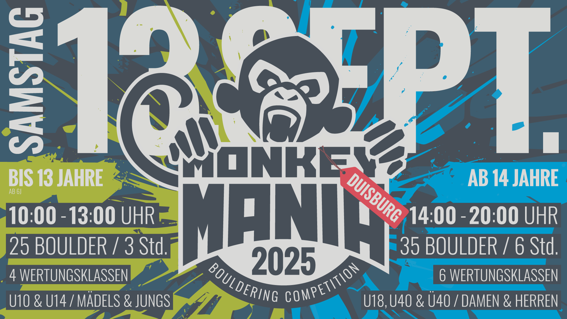 Am 13. September 2025 lädt die Monkey Mania Duisburg zum großen Boulder-Event ein – und das Beste: Zuschauen ist kostenlos!