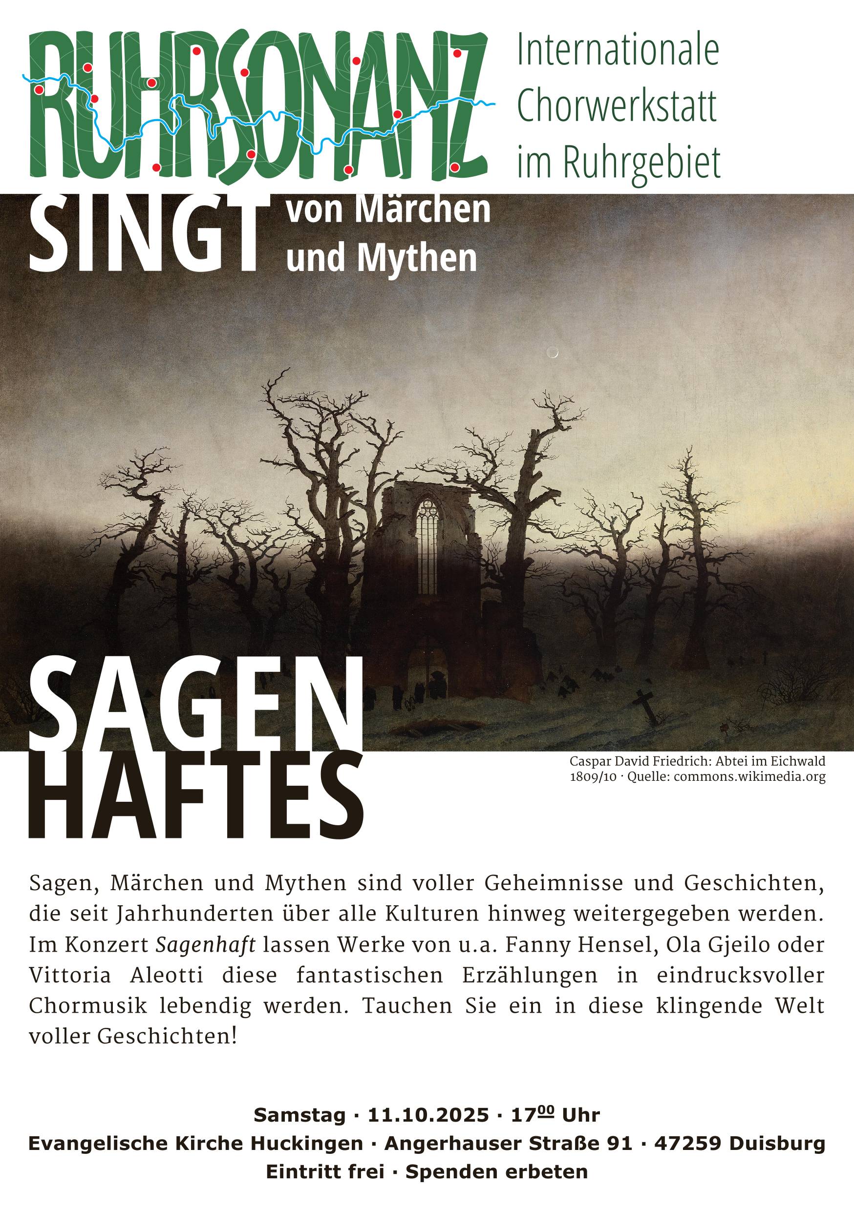 Sagen, Märchen und Mythen haben seit Jahrhunderten Menschen in allen Kulturen fasziniert und inspiriert. Mit seinem Jahresprojekt 2025 widmet sich der Chor Ruhrsonanz diesen fantastischen Erzählwelten und bringt sie in eindrucksvoller Chormusik zum Klingen.