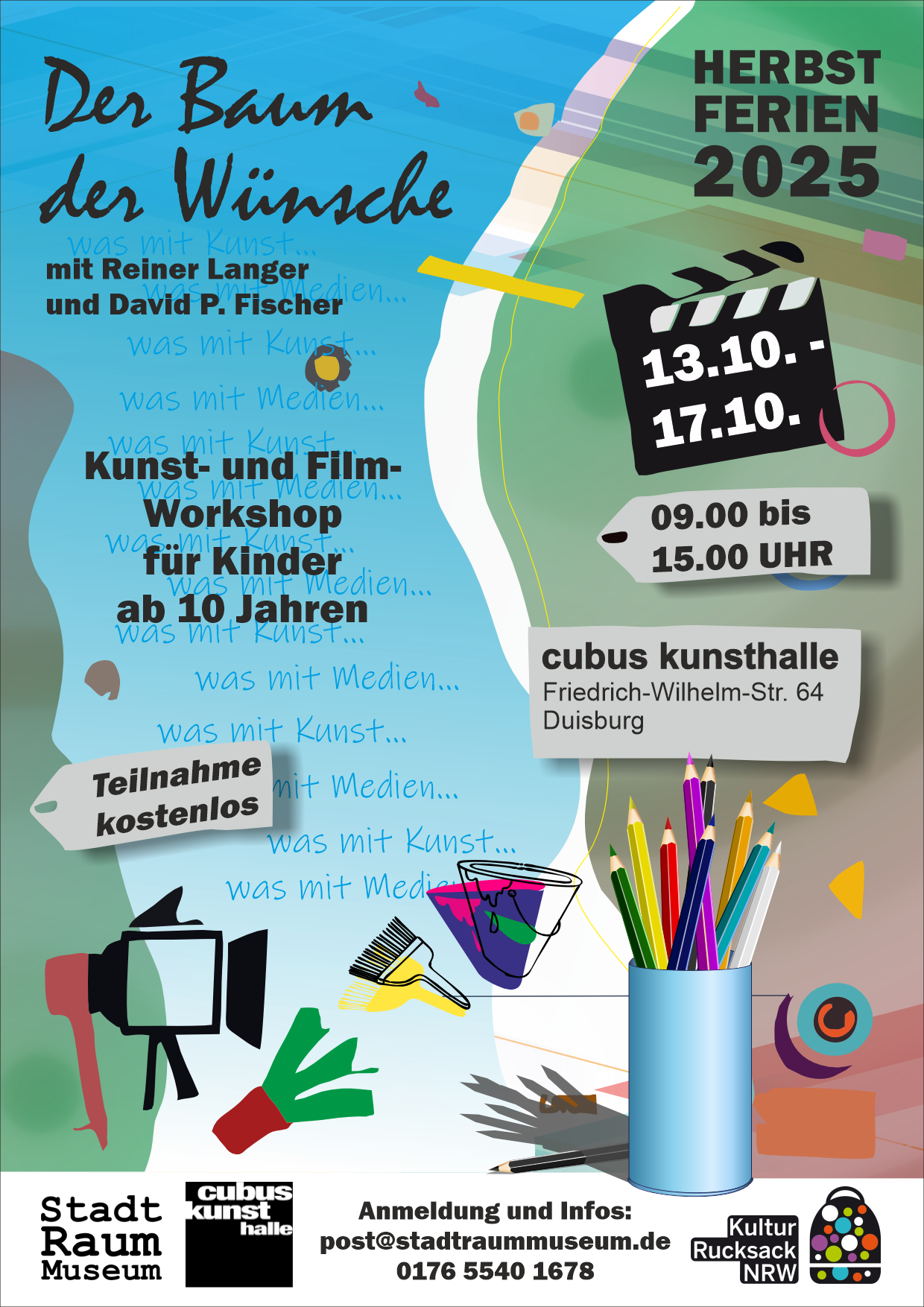 Kinder und Jugendliche im Alter von 10 – 14 Jahren laden wir in der ersten Herbstferienwoche zum Kreativ- und Medienworkshop mit Reiner Langer und David P. Fischer in die cubus kunsthalle duisburg (Friedrich-Wilhelm-Str. 64, 47051 Duisburg) ein.