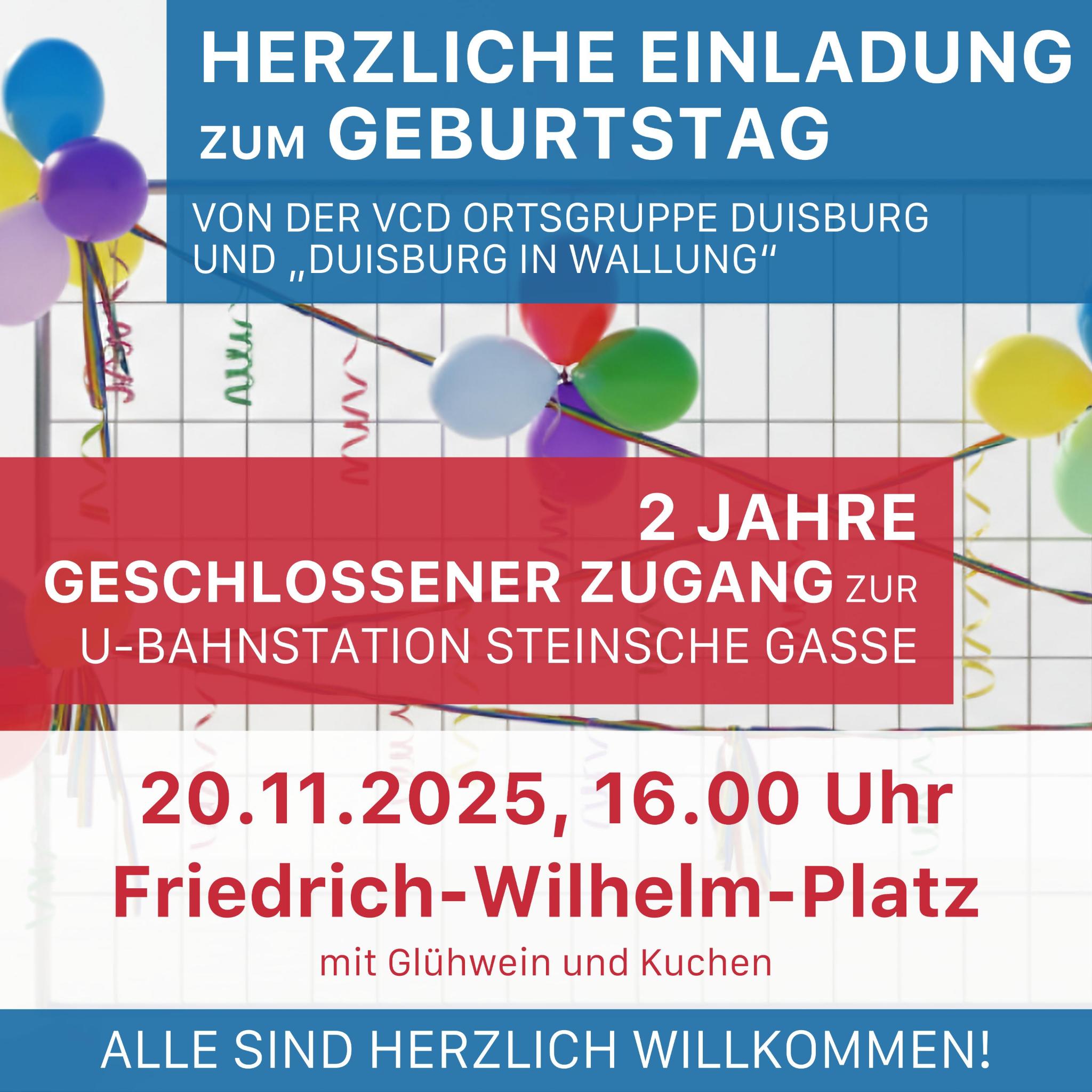 Seit Juni 2023 bauen DVG und Stadt Duisburg an der U-Bahn-Haltestelle "Steinsche Gasse" einen Aufzug ein. Seitdem sind vom Friedrich-Wilhelm-Platz und von der Kasinostraße aus alle Zugänge in die U-Bahn gesperrt, auch die Treppen und Rolltreppen. Die Initiative "Duisburg in WALLung" und die Ortsgruppe des VCD fordern, dass diese Baustelle endlich fertig gestellt werden muss bzw. zumindest teilweise der Zugang wieder möglich sein muss. Seit über 2 Jahren leiden Fahrgäste und Geschäfte am Sonnenwall. Bei Glühwein und Keksen wollen wir ins Gespräch kommen, Politik, DVG, Stadt, Medien, befreundete Initiativen, Geschäftsleute und Fahrgäste sind herzlich eingeladen!