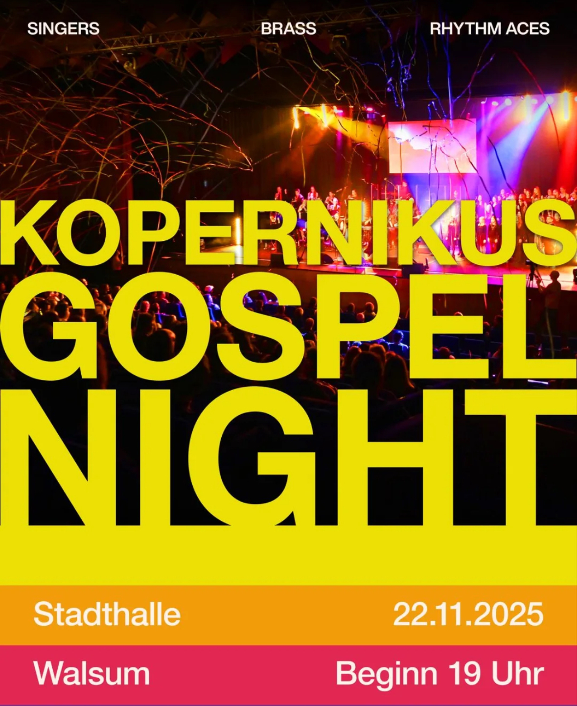 Die Kopernikus-Gospel-Night gehört seit vielen Jahren zu den musikalischenHighlights in Duisburg. So spielte der Kopernikus Gospel Chor in den vergangenen Jahren regelmäßig in der Walsumer Stadthalle aber auch im Theater am Marientor, dem Landschaftspark Nord und auf vielen anderen Veranstaltungen vor vollen Rängen.