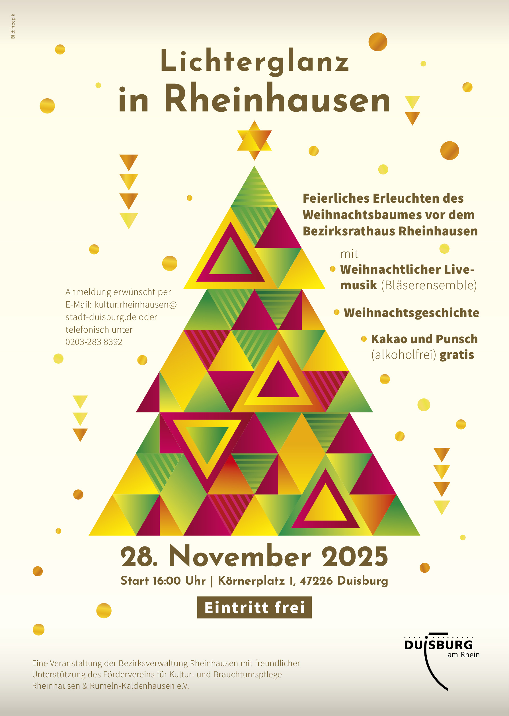 Am 28. November 2025 lädt die Bezirksverwaltung Rheinhausen, gemeinsam mit dem Förderverein für Kultur und Brauchtumspflege Rheinhausen & Rumeln-Kaldenhausen e.V., zur feierlichen Einweihung des festlich geschmückten Weihnachtsbaumes vor dem Bezirksrathaus Rheinhausen ein. Gemeinsam mit den Besucherinnen und Besuchern wird Frau Bezirksbürgermeisterin Elisabeth Liß die Lichter des prächtigen Tannenbaumes entzünden und damit den Beginn der stimmungsvollen Advents- und Weihnachtszeit einläuten. Die Rheinhauserinnen und Rheinhauser können sich über einen schönen Weihnachtsbaum vor dem Bezirksrathaus freuen, der mit mehr als sieben Metern Höhe in diesem Jahr besonders beeindruckend sein wird.