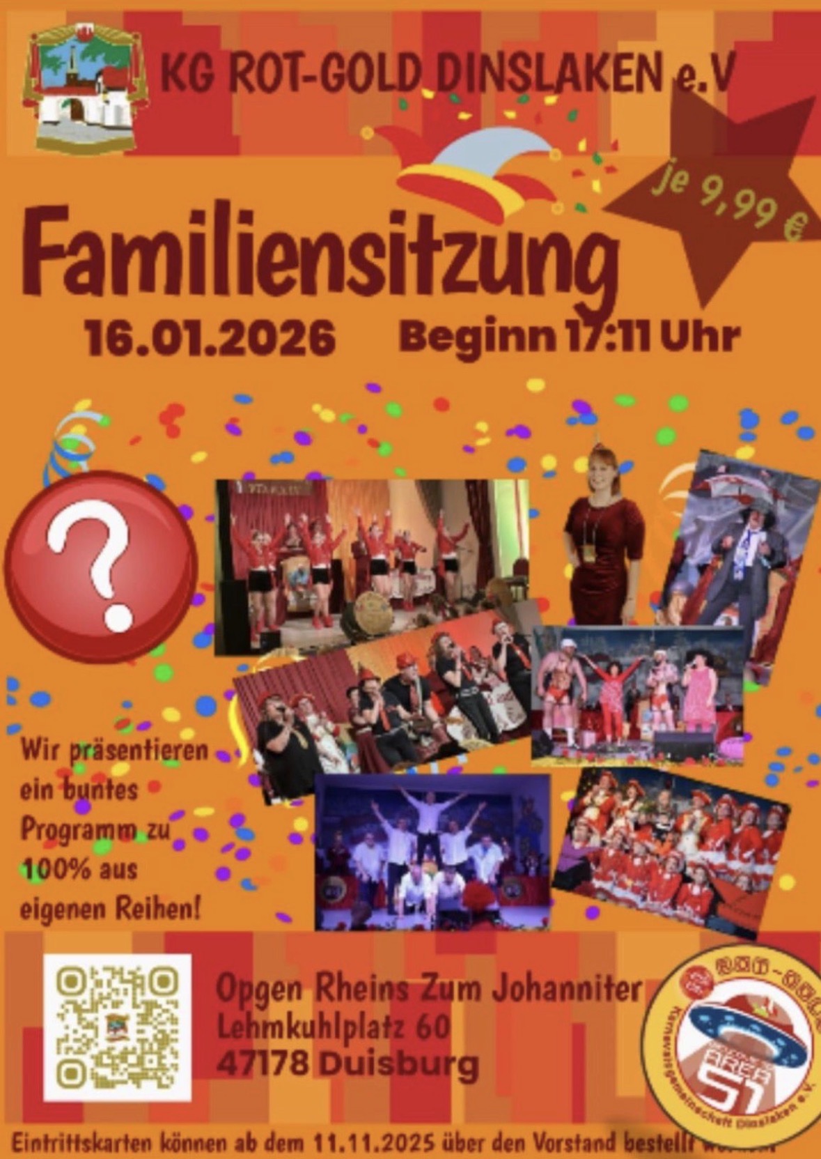 An einem festlichen frühen Abend erwartet die Besucher eine mitreißende Familiensitzung der Karnevalsgemeinschaft Rot-Gold Dinslaken e.V. In der gemütlichen Atmosphäre von Opgen Rhein's Zum Johanniter wird ein abwechslungsreiches Programm für jung und jung gebliebene geboten. Die Self-Made Karnevalisten präsentieren stolz ihre eigenen Talente, die von Garde- und Showtanz über humorvolle Clowns bis hin zu mitreißenden Gesangsgruppen reichen.