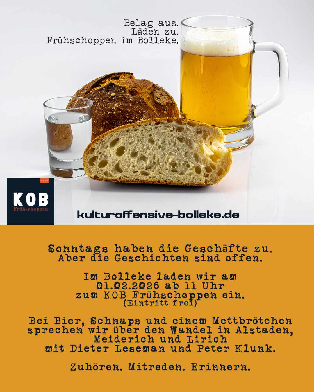 Die Ausstellung verbindet historische Fotografien, Texte und persönliche Erinnerungen und zeigt, wie eng die Lebensgeschichten der Stadtteile miteinander verwoben sind. Im Anschluss an das Gespräch besteht Gelegenheit zum Austausch bei einem Frühschoppen oder einer Tasse Kaffee. Alle Interessierten sind herzlich eingeladen, zuzuhören, mitzuerzählen und Geschichte gemeinsam zu entdecken.