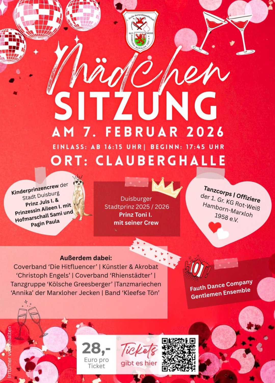 Die Mädchensitzung der KG Rot-Weiß Hamborn Marxloh – ein Abend nur für die Ladies! Freut euch auf mitreißende Stimmung, tolle Musik, spannende Shows und jede Menge Spaß. Gemeinsam lachen, tanzen und feiern – hier ist gute Laune garantiert! Es wird legendär!