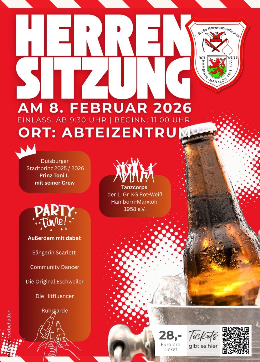 Die Herrensitzung der 1. Gr. KG Rot-Weiß Hamborn Marxloh – ein fröhlicher Vormittag nur für die Herren! Freut euch auf Musik, beste Stimmung, lustige Unterhaltung und jede Menge Spaß. Gemeinsam lachen und feiern – ein Highlight, das gute Laune garantiert!