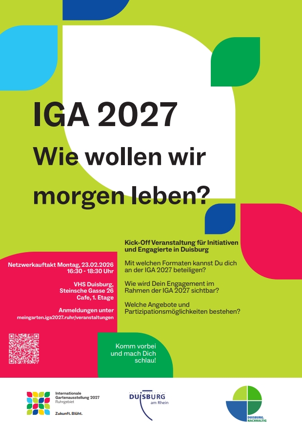 Mit Blick auf die Internationale Gartenausstellung (IGA), die vom 23. April bis zum 17. Oktober 2027 ins Ruhrgebiet lockt, lädt die Stabsstelle Klimaschutz der Stadt Duisburg zu einer Kick-Off-Veranstaltung.