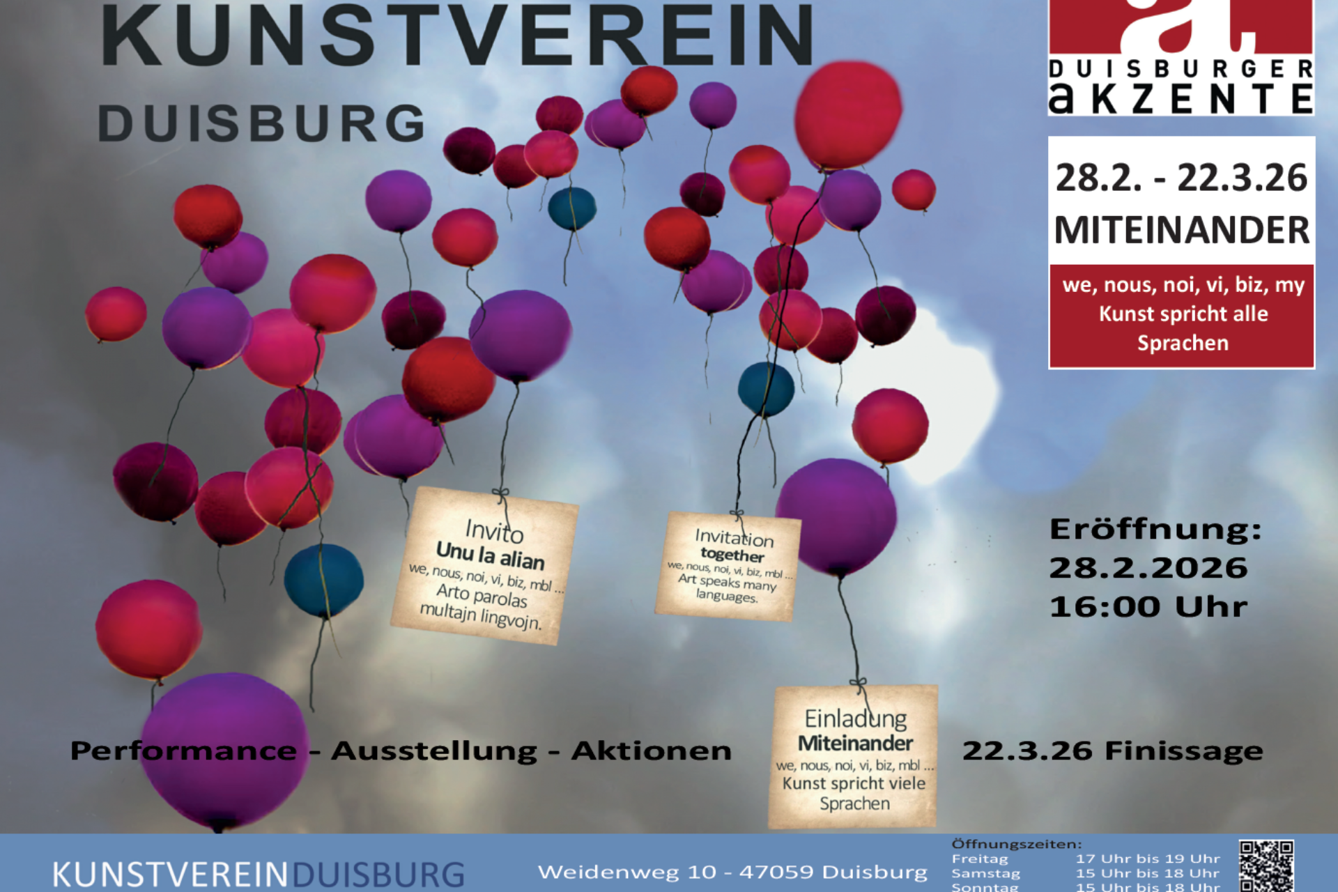Eröffnung am Sa. 28.02.26 um 16 Uhr mit der Performerin / Sängerin Susanne Hille, die Spannungsfelder zwischen Nähe und Distanz untersucht. Eine jurierte Themenausstellung betrachtet das „MITEINANDER“ aus künstlerischer Sicht und wird von der Historikerin Dana M. A. Bulic eingeordnet und besprochen. Die Ausstellung endet am 22.03.26 mit der Verlosung und Gewinnausgabe der Kunstwerke ab 16 Uhr.