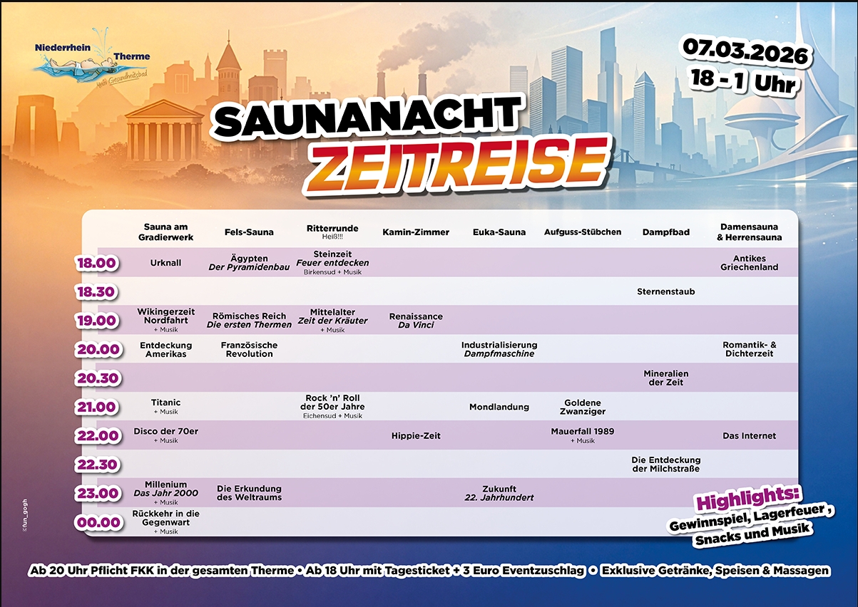 Lasst Euch überraschen und genießt eine behagliche Auszeit! An diesen Nächten verlängern wir die Öffnungszeit bis 1.00 Uhr, sodass Ihr genügend Zeit zum Erholen und Schwitzen habt.