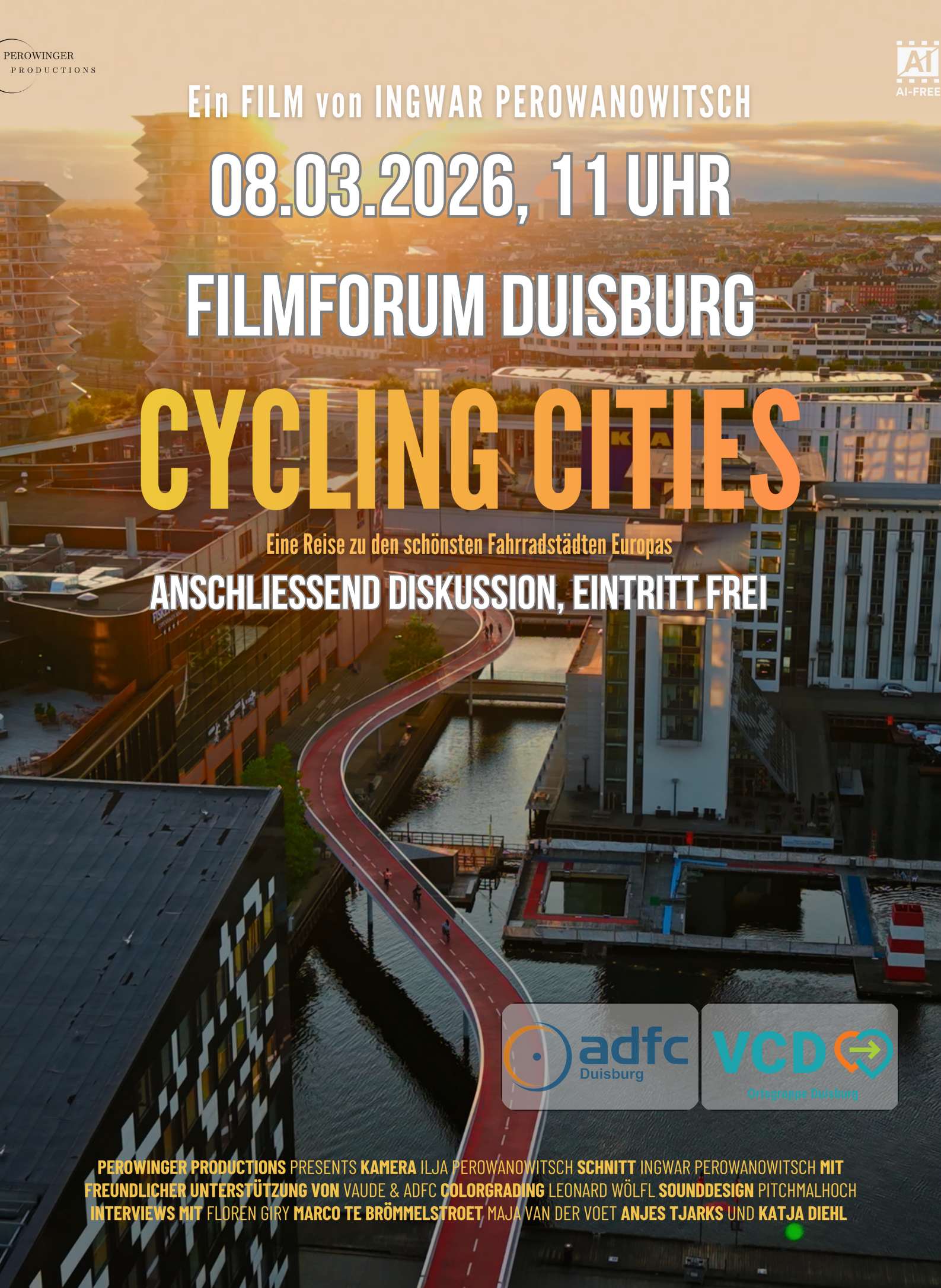 ADFC und VCD Duisburg laden ein und zeigen den Film „Cycling Cities“, der europäische Vorreiter der Verkehrswende zeigt.