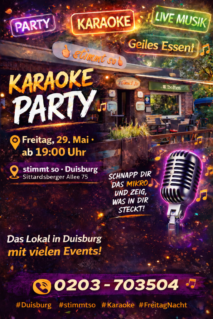 Die Atmosphäre wird durch Livemusik und die besten Karaoke-Hits zum Leben erweckt. Lass dich von der Stimmung mitreißen und genieße leckeres Essen, während du mit Freunden feierst. Sei Teil dieser unvergesslichen #Party und erlebe einen Abend voller Gesang, Lachen und Gemeinschaft. Mach dich bereit für einen stimmungsvollen Abend, der dir noch lange in Erinnerung bleiben wird!