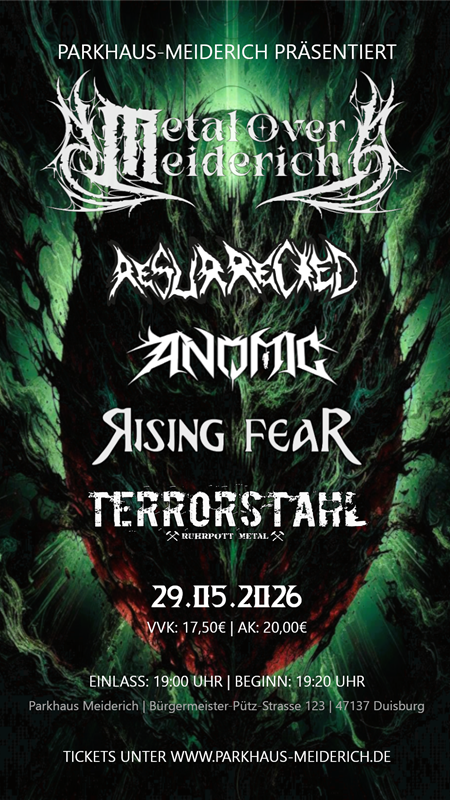 Am 29. Mai 2026 wird es laut in Meiderich! Bei „Metal over Meiderich“ erwartet euch ein kompromissloser Abend voller Death- und Thrash-Metal-Power mit vier starken Bands aus dem In- und Ausland. Freut euch auf eine explosive Mischung aus apokalyptischer Wut, technischer Präzision und moderner Härte!